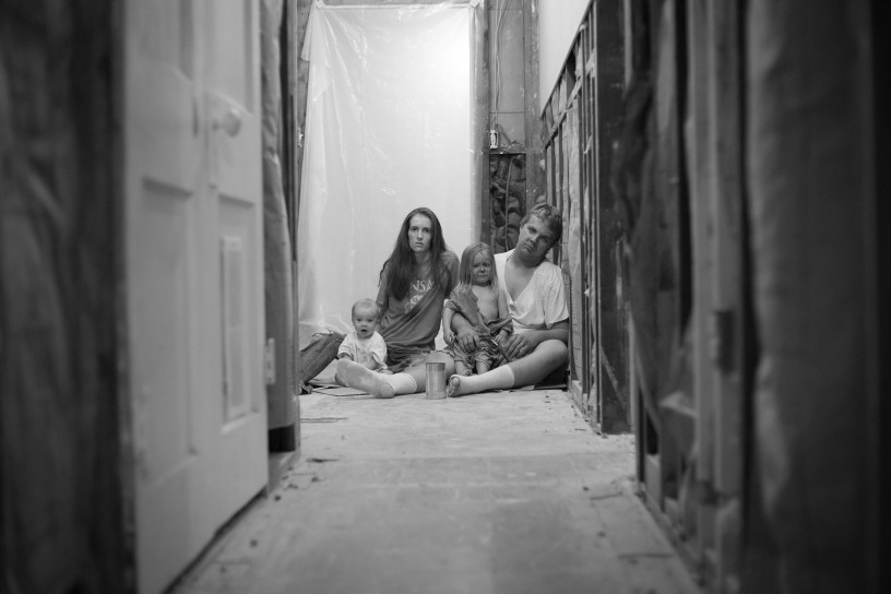 All in all, we had a wonderful year. We weren’t really homeless but at times it felt like we were. There were stages of the demolition and remodel, that we wondered if we were making a huge mistake. It felt like we would never be done with this project. We are still far from finished with the house but despite not having a bathroom door, it’s starting to feel like home. We are pretty sure, we will never buy another fixer upper. It’s not nearly as fun as it looks on HGTV! We could not have done any of it without all of our friends and family who gave up their evenings and weekends to come over and get their hands dirty with us. They spent countless hours tearing out walls, ceilings, and flooring, running new electrical, putting up new insulation, hanging sheetrock, mudding and sanding, plumbing, assembling our bathroom, laying flooring and tile, painting, and sometimes watching our kids so we could work with both hands. We owe you guys much more than a simple Thank you! The picture on our Christmas card was taken in Ellie’s room. The studs behind us were for the wall separating her room from the bathroom. In the picture, you can see from Ellie’s room into the bathroom and from the bathroom you can see the mudroom and kitchen. At one point the only thing separating the mudroom, bathroom, Ellie’s room, our room, and the hallway were studs. The black and white picture that is featured on this post is us sitting at the end of the hallway after it had been insulated and we were starting to put sheetrock back up.