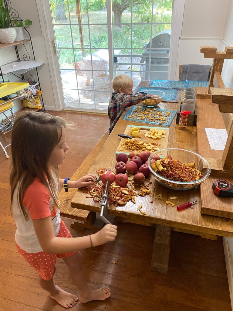 We also picked some apples from bonus grandma and grandpa’s house this year and tried our hand at preserving those as well. We had sooo many apples! We made apple sauce, apple pie filling, dehydrated apples, and some apple juice. The kids and I spent hours peeling and coring apples but they loved every minute of it.