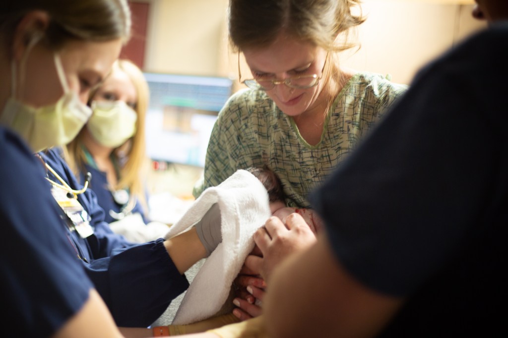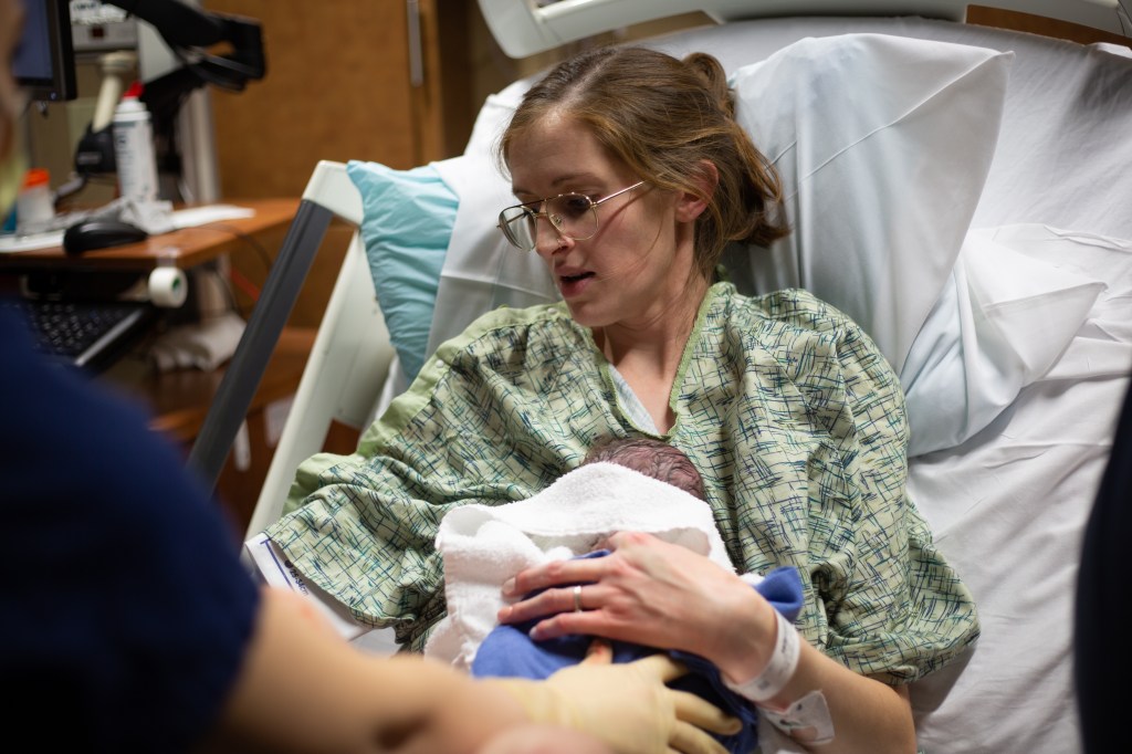 Contractions still weren’t consistent and strong so I did as much moving around as I was comfortable doing. Poor Austin was starting to get a little stir crazy by the evening. At about 9:30 the midwife asked me if I wanted checked again and told me I was only about 6cm. We had a few options at that point. We could keep hanging out and waiting for things to speed up, we could start some pitocin, or we could break my water. None of those were exciting options but after weighing our options, I decided to have her break my water. It wasn’t what I originally wanted and I could have continued to labor and given my body all of the time that it needed but I was tired and I felt like breaking my water was the best way to keep things moving. As soon as my midwife broke my water, contractions became stronger and really close together. I kept moving around to let gravity keep doing it’s job. After about two hours I was ready to change position again and knew that we were REALLY close to having a baby. The bottom of my bed was lowered so I got up onto my knees there and had my arms around Austin’s neck while he stood at the bottom of the bed. As soon as I got into that position, I had one big contraction and I said “he’s coming.” Austin took it as a general statement and didn’t take me very seriously. I said it again, a little louder and he just kept standing there. I finally grabbed my hospital gown out of the way and reached down and caught Stetson’s head. Austin finally realized that I was serious and he caught the rest of him. Austin says “I just looked down and saw the tops of his ears so I reached down there and caught him.” It was so fast and all happened in one contraction. My mom had run to the door to get the nurse and midwife but Austin and I were already holding our baby when they got in the room and put gloves on. He was born while the song Something to Hold Onto by The Turnpike Troubadours was playing. At least that’s what Austin told me later. Boy, did I give him something to hold on to!